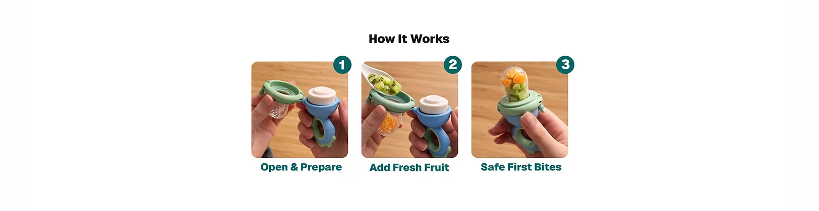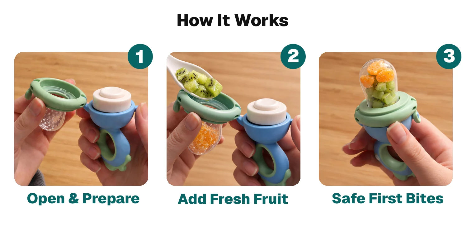 Introduce fresh fruit and soft foods safely while soothing teething gums. Designed to help your baby chew, taste, and explore without the risk of choking.